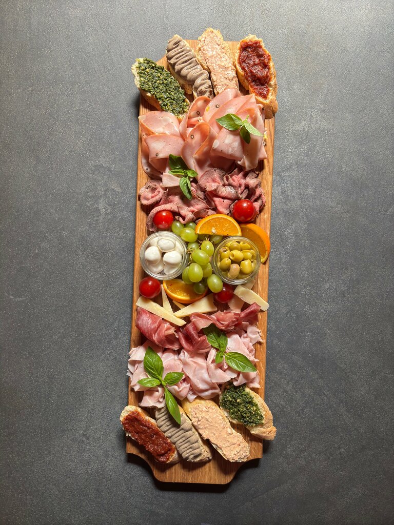 1,150 gПрошутто крудо, мортаделла, тамбовский окорок, ростбиф, пармезан, моцарелла, виноград, оливки, сезонные фрукты, мини-брускетты (8 шт: с куриным паштетом, песто, сырной намазкой и томатным джемом).