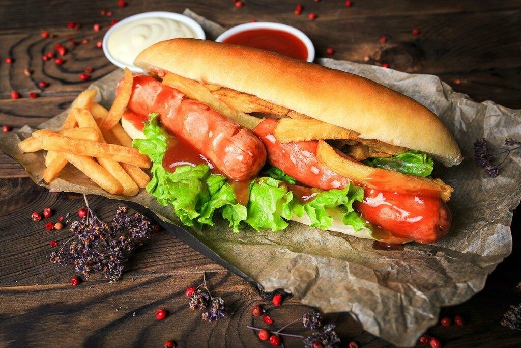 Булочка, сосиски, обжаренные на гриле, картофель фри, фирменный соус