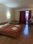 Hello. Convenient location - 3 minutes from the sea..There is a mini park with pine trees nearby. You can take a walk and also take shelter from the sun on the beach. The hotel is clean. Very large rooms (junior suite) I don't want to dance))). The bed is very big. The linen is white, clean, without stains. The room has a kettle, cups, dishes, spoons, glasses, and even a corkscrew. Fridge. There is a hair dryer, I don't know about the quality - we didn't use it. The only thing I didn't like was that you can smoke on the balcony and, accordingly, all the smoke from smoking in the neighboring rooms was our guest. And we don't like it because we don't smoke. The cleaning is mediocre. There is no variety of food. Nearby there is a shop, a first-aid kit and delicious coffee shops. There are also tents with souvenirs.