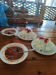 I won't look at the hints. After 3 visits, we decided to take a photo. The photo below shows one serving of borscht and two servings of Caesar salad. Anyone who wants to eat from the belly is here. We tried meat in Abkhaz style, and amguachapa (kuchmach), and lula kebab, and ajapsandal, and kharcho soup. In short, everything is delicious. We also drank homemade wine and homemade cognac. The service is top-notch. The girls are friendly. There are simply no words.