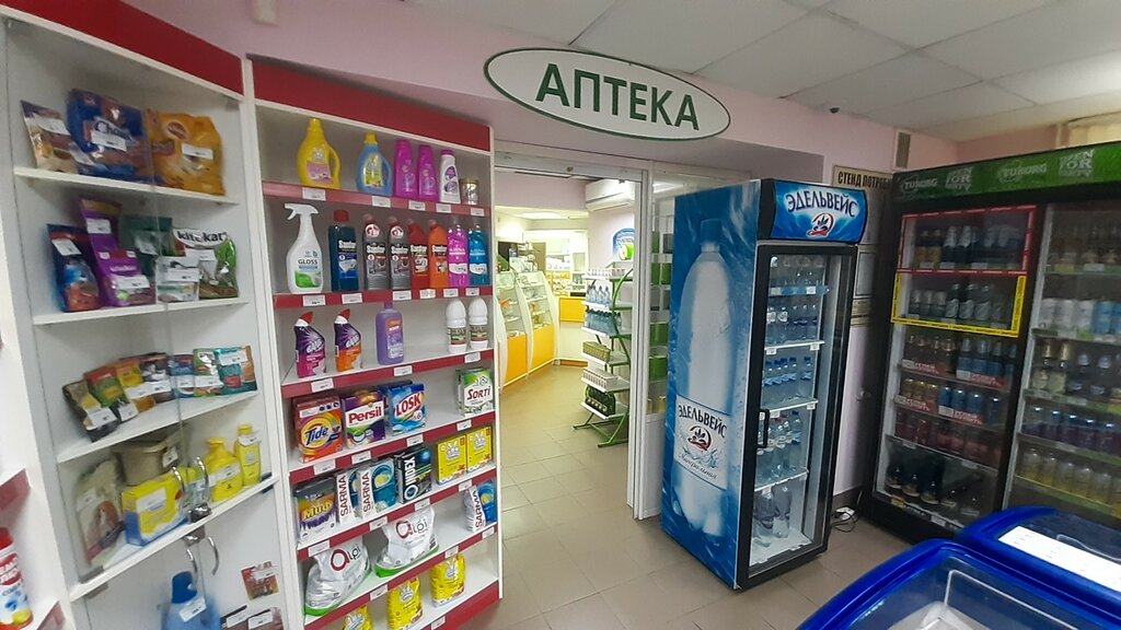 Хорошая аптека и магазин, есть базовые товары. В довольно свежие товары. Не сильно дорого, но иногда бывает. Персонал приятный. Расположение хорошее, у дома. В аптеке есть нужные лекарства. Работают до 22:00