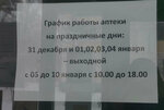 Приехал за заказом 31 дек, и на тебе. Выходной в аптеке, а все остальные работают. И никакой информации на сайте о графике работы в праздники!!! Даже, когда связывался с ними ничего не сказали. Проехал всю Москву. Испортили праздничное настроение. 5 дней теперь ждать лекарство. Ужасно. _------------ Ещё и нагло врут в лицо, что на всех площадках есть график. На сайте нет, в ВК нет (последняя новость в авг). А Яндекс площадка для того, чтобы вам законный КОЛ поставить.
