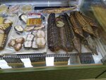 Выбор большой. Глаза разбежались и в итоге набрала кучу всего на пробу. Можно упаковать в вакуум выбранный кусок за 50 р. Копченые судаки, сомы, толстолобики и др. Вяленные вобла, чехонь, лещ и тд. Можно взять на сувениры друзьям уже упакованные маленькие пакетики вяленной рыбы ( соломка по 50 гр около 70 р): сазан, лещ, вобла, щука, красноперка и др.