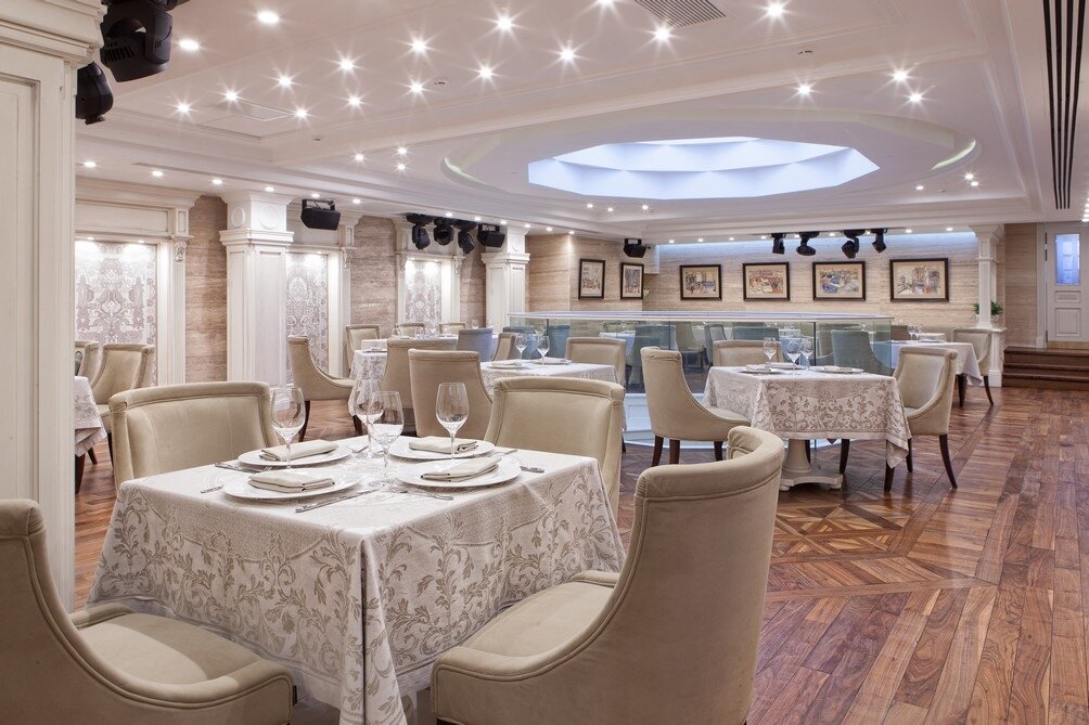 Зашли пообедать в воскресенье, предварительно забронировав стол. Народу было на удивление не много, учитывая дислокацию и время. Очень понравилось состояние ресторана внутри-все чисто, сверкает белыми скатертями. Посадили за большой, удобный стол. Нужно отметить, что места для гостей достаточно, на нем не экономят, как это обычно происходит в других заведения в центре, где стол на столе и столом погоняет. Стол тоже был большой. Меню без фантастических изысков, цены для места дислокации вполне (хотя нам показалось, что в интернете на сайте цены дешевле ,чем в меню ресторана), но особенно понравится официант, такое впечатление, что вернулся обратно СССР, где умели обслуживать и этому специально учили. Вообщем, рекомендую.