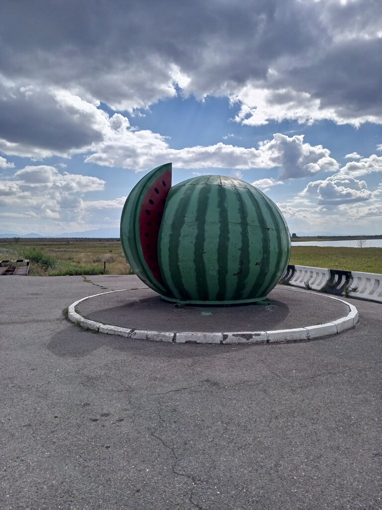 Плюсы: красивый пейзаж вокруг, озеро большое, остановка, парковка большая или это не парковка, мед продавали там же) на днях только первый раз вживую увидела этот "арбуз", а так у многих видела фото у арбуза) теперь и у меня такое фото есть+мед вкусный рядом купили) Минусы: с годами краска уже облезла на нём, нужен косметический ремонт точно)