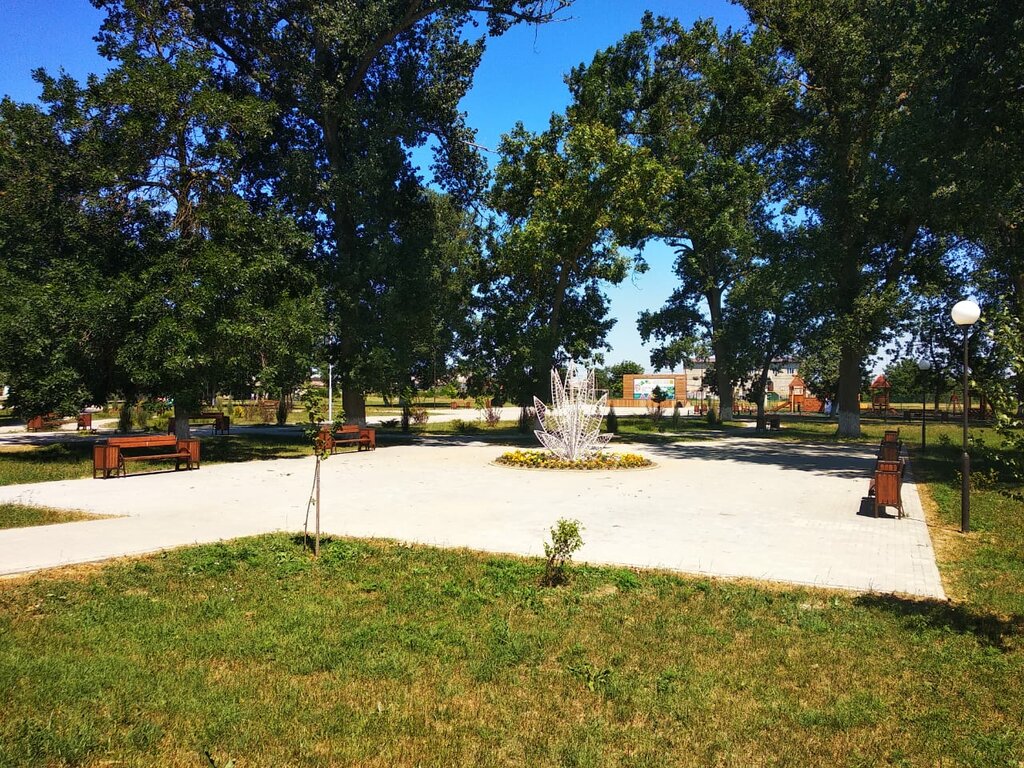 Аккуратная аллея с лавочками и тенью. Рядом детская, спортивная площадки. Летняя эстрада. Была днем, но есть подозрения, что жанровая скульптура "Арбуз" ночью светится.