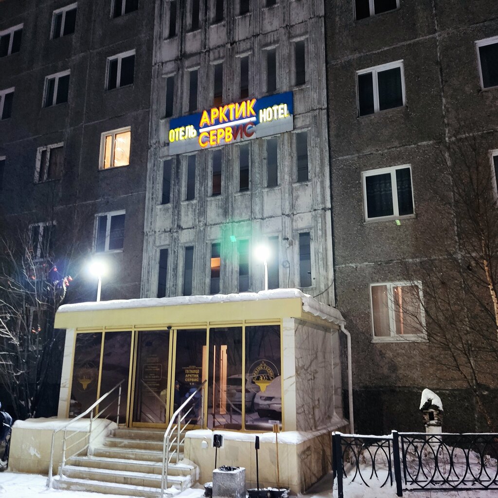 «Артик-сервис» — это уникальная по своим составляющим гостиница: здесь вы можете отыскать потрясающие номера, имеющие хорошую планировку и огромный метраж, а также фантастические виды на город и морской порт! Гостиница занимает целый подъезд многоквартирного дома, в связи с этим коридоры — это лестничные клетки, а номера — квартиры. Отмечу, что дизайн интерьера и общая композиция гостиницы будто бы отправляет жильцов на 15-20лет назад, в 00-10 года, когда в моде были кровати с вензелями и ковролины с замысловатым принтом, а также столовая/буфет, которая выполнена в стилистике пышного барокко, где стулья облачены в огромные чехлы с золотыми вкраплениями, но близость к достопримечательностям Мурманска, невероятные виды и отзывчивый персонал скрашивают все имеющиеся недостатки😁 Из минусов можно выделить только отсутствие уборки в номерах, а в остальном гостиница не уступает конкурентам с 2 звездами!