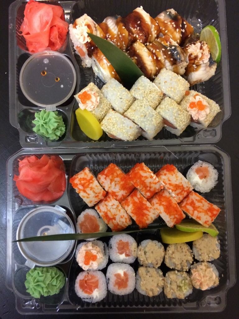 Variety of food:sushi and rolls, pizza, fixed meal