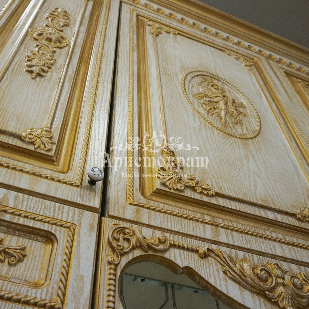 Премиальный выбор ценителей искусства Неповторимая спальня, сочетающая в себе элементы роскоши и долговечности. Материал: Корпус: ЛДСП Фасад: МДФ крашенный+патина+декор из пенополиуретана