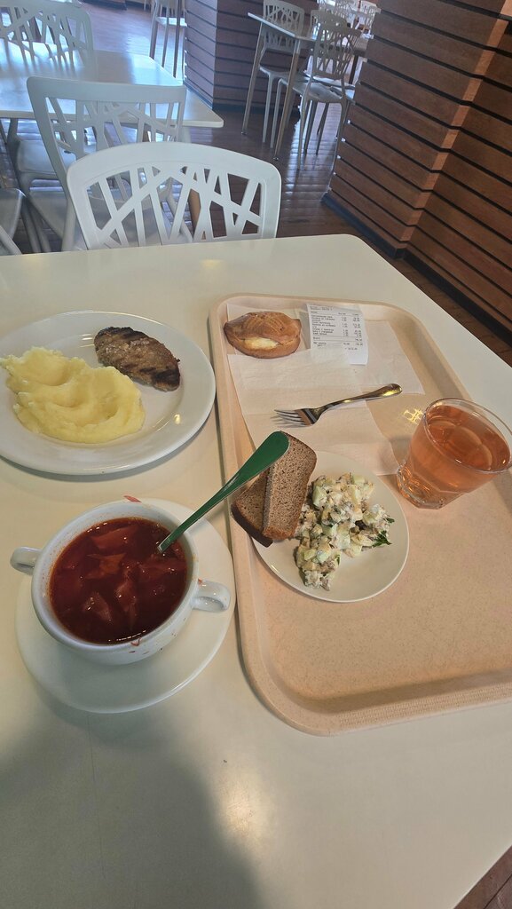 Ужасная столовая, с каждым днем все хуже и хуже и самое главное руководству на это абсолютно все равно. Посуда со сколами, бывает «жирная». Еда не вкусная от слова совсем, особенно учитывая цену, стандартный набор (если мы берём не комплексный обед) на двоих выйдет примерно 900 рублей, за эти деньги вкуснее можно пообедать в соседних местах! Бывает даже блюдо сырым. Если прийти после 14:00 в любой день, будут уже остатки! На завтрак к сырникам продается джем, который был как минимум один раз просроченный.