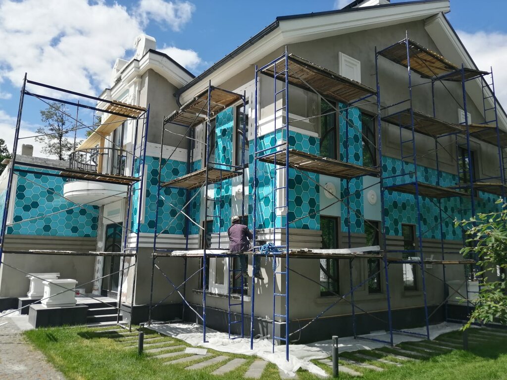 Нанесение мозаичной декоративной штукатурки и затирка под фактуру. Используется на цоколе и частичными вставками. Полностью фасад делать нельзя