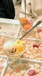 Кафе находится в подвальном помещении. Интерьер в целом красивый, интересные столики с десертами под стеклом. Мягкая мебель уже нуждается в чистке. Один шарик мороженого стоит 150 руб - дороговато, если бы еще по вкусам было "вау", то можно было бы понять. А так цена высоковата для мороженого. Брали по 3 шарика каждому, цена, соответственно, вышла в 900 руб. Из опробованных 6 вкусов понравились только 3 (кофе; черника; халва, курага и чернослив), остальные 3 посредственные (лимонный крем; текила санрайз; брусника) и заявленного вкуса не случилось. Повторно бы не зашли, но один раз зайти и попробовать что-то новое для себя можно.