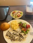 Заказываю шаурму с говядиной на тарелке, прошу что бы кортошку фри не ложили. Салаты этой шаурме свежие и капуста, огурцы и помидоры. Подают булочку к шаурме, тоже сведая и теплая. Вкусный цезарь с курицей. На 3, но намного вкуснее чем Центр плова. Так же пробовали осетинский пирог с сыром. Тоже вкусный. Из минусов вентиляция слабовата, сидения из дермантина и уже есть порааные места.