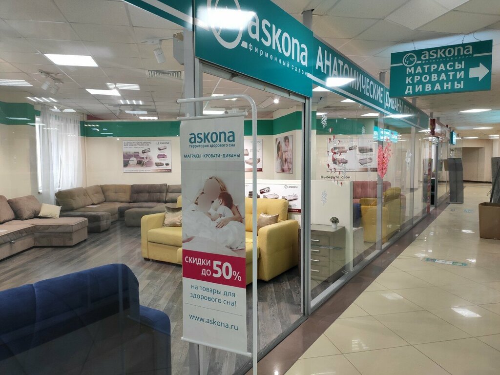 Огромный салон, находится центре города, на Гайдара 55. Очень удобно добираться. В салоне можно посмотреть практически весь ассортимент "Асконы" Менеджеры вежливые, всё показали, рассказали. Покупала здесь покрывало, подушки. Качество радует. Собираюсь за матрасом с кроватью, и только в этот салон!