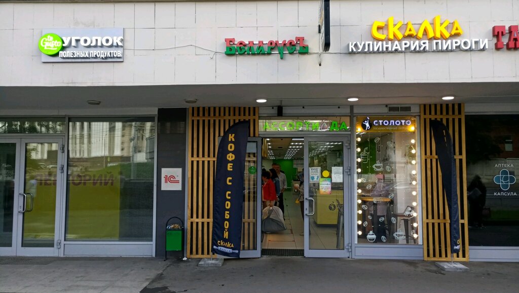 Отличное место. Там в одном помещении несколько разных лавочек. Есть Скалка, там отличные вкусные пироги и разные приятные салатики, можно на вынос, можно кушать на месте. Но цены я бы не сказала, чтоб маленькие. И еще там есть лавочка с беларусскими продуктами, в основном колбасные, сырные и подобные готовые к употреблению изделия. Вкусные штучки. Тоже очень приятное место. Есть пункт приема в химчистку. Остальные лавочки постоянно меняются, открываются-закрываются.