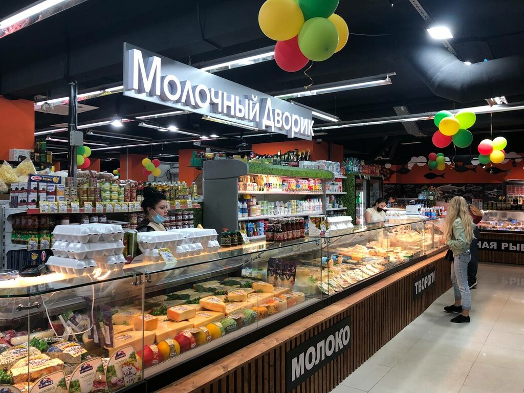 Молочный дворик вполне себе , есть мясной отдел, Рублёвский, точка с орешками и сухофруктами и овощи -фрукты. Какой то совсем маленький отдел со сладостями, торты совсем неудачные . По моему нет отдела с крупами, по крайней мере я его даже не вижу, если и есть ))) Удобно, что рядом винлаб. С другого конца шаурма и выпечка, но че то я не рискую там брать ))) Если нужно быстро какие-то определённые продукты, то захожу, но не сказала бы, что большой выбор.