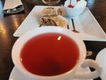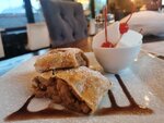 Всё бы ничего, но чего-то не хватает. Наверное, истинной душевности... Для Елабуги, вероятно, это одно из самых почётных мест - судя по масштабам и некоторой помпезности. Обнаружили случайно, открыв карту. При всей заявке на роскошь, масштаб и солидность - на летней веранде было нестерпимо жарко. Да, лето такое, но почему бы не поставить, например, вентиляторы? К сожалению, чек нам отправляли сутки - пришлось даже напоминать. К сожалению, в счёте (абсолютно пустой зал!) присутствует какая-то нелепая "вечерняя надбавка" в 10% - говорят, что есть в меню, но, видимо, мелко-премелко. Интересный штрудель, мило смотрится мороженое брусочками - видом масло!) Вкусный также отварной с овощами рис. Красивый чайник, заварка россыпью, по армудам (стаканчикам) чай, словно вино, разливает официант. Попросили чайную пару - нам подали, но выбор чашек ограничен - только белые, они несколько простят витиеватой формы чайник из металла... Вообще, сервировка достаточно продуманная, но удивили чайные ложки - на фоне всех других по-приятному тяжёлых столовых приборов они оказались тонкими, лёгкими и явно из другой лиги предприятий питания... Странно. Салат из хрустящих баклажанов оригинален, порция внушительная (вполне получилось бы за основное блюдо), но очень острый томатный соус, благо он под салатом. Этот соус, пожалуй (даже определённо!), куда острее, чем подобный, подававшийся к люля-кебаб. Что интересно, люля-кебаб-то сервируется почему-то без соуса... Предложили купить отдельно, пришлось согласиться. Девочки, конечно, старались - настолько, насколько их научили. В этих рамках они справились на максимум, даже разрешили забрать котят от местной кошки (помещаются на ладони), но мы ждём следующего визита - пусть котятки подрастут немножко. Было озвучено (при выборе блюд), что кухня ресторана специализируется на мясе, но, честно говоря, пельмени как пельмени, люля-кебаб - без умопомрачения, мясо мясом. Украшено красиво.