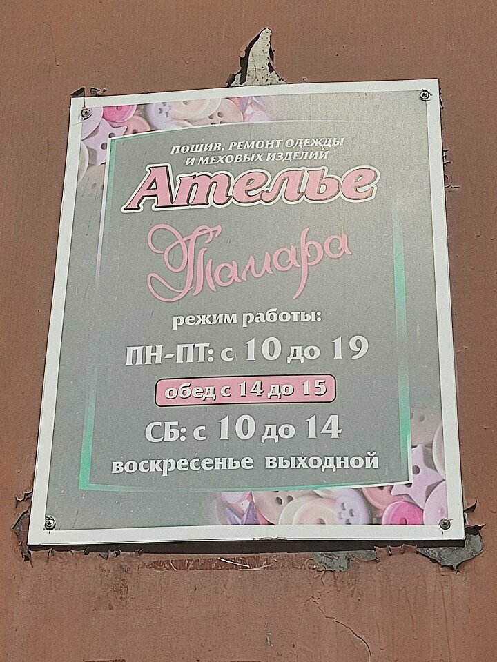 Ателье Тамара уже более 20 лет оказывает жителям микрорайона по ремонту одежды и реставрации даже меховых изделий услуги оч качественно и недорого всем рекомендую!