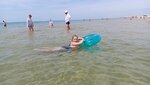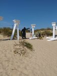 Пляж расположен в 15 минутах пешего шага по береговой линии от городского пляжа. К пляжу привозит автобус от отеля, но до моря ещё нужно пройти через песчаные дюны по досчатой дорожке, которую уже можно бы и обновить, т. к. местами и гвозди вылезли, и дощечки разшатались. На пляже установлены навесы, шезлонги, душ, туалет, раздевалка, детское игровое оборудование и батуты - все необходимое для комфортного отдыха. Приятным бонусом для клиентов отелей является ежедневная анимация для детей и взрослых. Проводятся зарядки, игры, развлечение. Рядом расположены пляжи лагерей. Минусом считаю отсутствие медицинского пункта, его видела только в зоне расположения лагерного пляжа, слава Богу не пригодилось, но для спокойствия лучше бы он был. Берег ракушечно песчаный, достаточно долго мелководье с постепенным углублением. В принципе вода чистая, но после шторма прибивает много тины, ее убирают периодически, в целом чище чем на городском пляже и людей меньше.