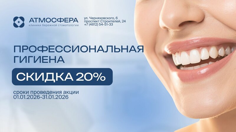 Скидка 20% на профессиональную гигиену полости рта в январе В клинике бережной стоматологии «Атмосфера» в Смоленске на ул. Черняховского, 6...