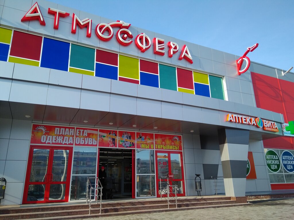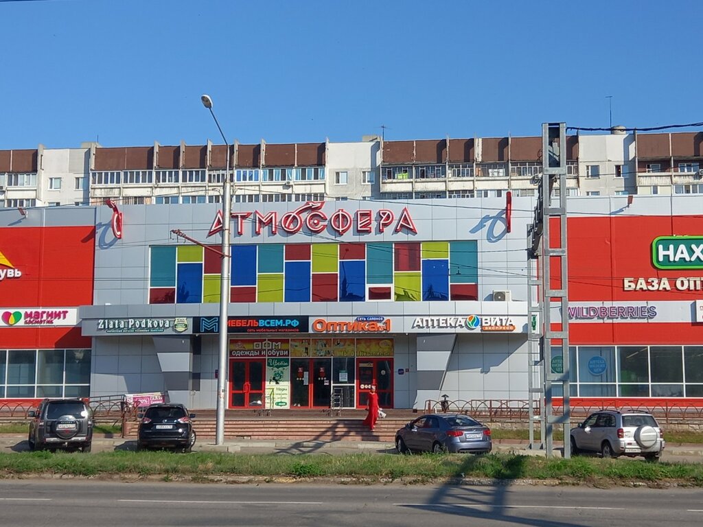 В ТЦ Атмосфера, много бутиков ,аптека, Русская Дымка, магнит косметик, супермаркет Находка и ещё много чего. Для жителей микрорайона удоьно и выгодно. Рядом остановка транспорта, легко добраться до места.