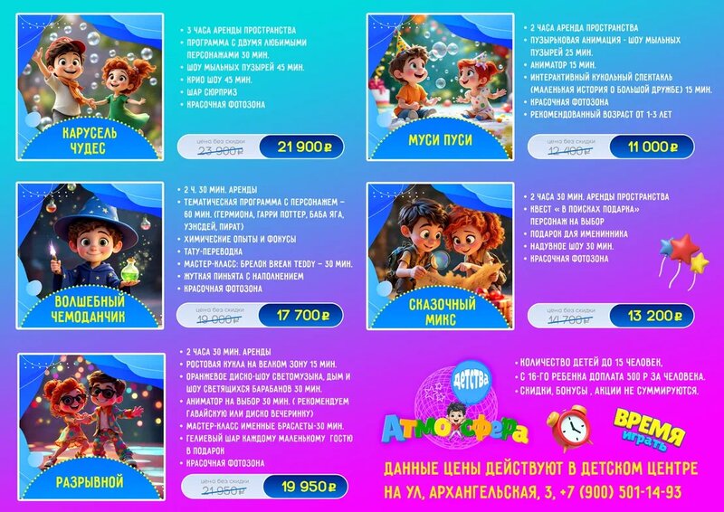 Волшебный праздник для нашей принцессы! Нашей малышке исполнялся годик, и мы начали искать уютное пространство для первого в ее жизни Дня рождения. По рекомендациям других мам я обзвонила несколько детских центров в городе, и мой выбор уверенно остановился на «Атмосфере детства» — уже после первого звонка я почувствовала здесь искреннюю заботу и внимание к нашим пожеланиям. В отличие от других мест, где сразу предлагали шумные программы с ростовыми куклами и навязывали дополнительные услуги. Владелица центра, Екатерина, подробно рассказала, что маленькие именинники могут испугаться крупных персонажей, и предложила костюмированного героя. Она помогла выбрать сценарий с акцентом на игры для годовасиков, но так, чтобы и ребятам постарше было весело и интересно. Праздник мы провели в уютном пространстве на Архангельской. Это было волшебно! Малыши и детишки постарше были в полном восторге от интерактивных занятий и игровой зоны. Отдельное спасибо администратору Анастасии; нашему солнечному аниматору, которая смогла увлечь и очаровать всех без исключения; ну и пространству и Екатерине за гостеприимность. Мы обязательно к вам вернемся и уже от всей души рекомендуем «Атмосферу детства» всем, кто хочет подарить своему ребенку праздник, наполненный теплотой, радостью и настоящим волшебством!