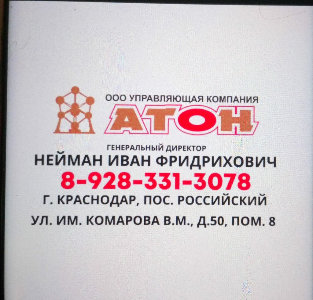 Сейчас изменился адрес нахождения. Находятся в посёлке Российском. Собрали со всего дома 6 000 000 рублей, за подключение дополнительных мощноностей. Т. К в доме изначально их не хватало. Поверили Ивану, люди сдавали деньги. А по факту ни денег ни света так и не увидели. Обслуживание дома оставляет желать лучшего. Сосульки просто падают на машины и людей, крыша на доме протекает регулярно, песок начинаем просить с мая на детскую площадку, привозят в июле. И то извините некондицию полнейшею, совсем не для детской плащадке. До ук Атон было не сладко, но такой наглость и такого отношения мы не встречали. Кинул людей на деньги и все. Не переходите в данную ук, если сейчас у вас все плохо, с ними будет ещё хуже и без денег останетесь ❗❗❗