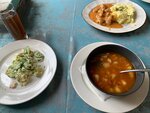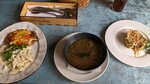 Я не знаю что там происходит вечером,но бизнес-ланч подарит незабываемые впечатления. 23.10.24 решили пообедать, по отзывам, сносная еда за относительно небольшую цену. Но, есть очень много НО...Абсолютно мёртвый официант, кстати он там в обед один в смене. Минут 5 стояли возле грязного стола, потом пришлось самим собрать посуду на край, вот уже на этом этапе, нужно было всё понять, ну, тут списали на человеческий фактор. Заказали 2 полных ланча, нам принесли довольно неплохой салат, с чёрствым хлебом, ладно. Далее в подаче ресторана идёт второе. За вилками, кстати, пришлось идти самостоятельно. Суп с компотом подаётся в последнюю очередь, видимо что бы суп в сухомятку не кушать, не знаю, от супа с компотом мы отказались, т.к. на тот момент, прошёл час как мы пришли и ни времени, ни терпения у нас больше не было. P.S. Чуть не забыла, на капучино рассчитывать не стоит, потому что молока нет. В ресторане, молока нет...