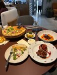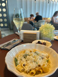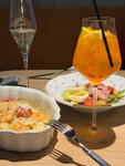 Очень учтивый персонал , спасибо вам за это. Заказали очень вкусный салат с тунцом. Это что-то с чем-то. Так же попробовали пасту с креветками. Божественный вкус. Открытая кухня позволяет любоваться работой поваров. P. S. Ну и конечно Безлимитное игристое , как гарант хорошего вечера.