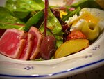 4 звезды с большой натяжкой. 1. Салат «август» не понравился - соус очень жирный и не вкусный, креветки холодные( скорее всего готовили не дня меня, а заранее сделали заготовку) и пресные. Яйца приготовлены хорошо, романо свежий, сочный. 720₽ в чеке, в меню 740₽. 2. Цветы цукини фаршированные кроликом. Звучит интереснее и вкуснее, чем блюдо получилось на самом деле. Цена в меню 880₽, а в чеке пробили 940₽. 3. Паста с лисичками вкусная, пармезан хороший. 620₽ 4. Утиная грудка понравилась, только уж очень маленькая. 920₽ 5. Десерт муссовый «лимон» - на любителя кислого. 480₽ 6. Чай с вишней 460₽ сомнительно, но окей) Мы указали на несоответствия цен в меню и чеке (одно блюдо дороже на 60₽, другое дешевле на 20₽), без всяких ожиданий, а в качестве комплимента мне подарили макаронс. Приятно) Спасибо! P.S. 1. Цены слишком высокие по сравнению с качеством блюд и названием «бистро». 2. Повара работают в футболках, не в кителях. Выкладывают все голыми руками. Когда такое вижу я, доверие к кухне падает. Хотя бы повара на «отдаче блюд» облачить в китель. 3. Специально ехать сюда второй раз не стану.
