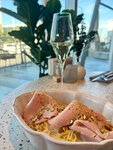 Из плюсов -интерьер, расположение , панорамные окна. Обслуживание на 3-4. Как-то не зацепили. Из минусов и почему я скорее всего не приду больше сюда, если только не будет нужно назначить встречу именно в этом районе: атмосферы какой-то особенной нет: музыка так себе, воды чистой нет -платите (ок ребята , удачи вам в бизнесе на воде), хотя в приличных ресторанах и кофейнях тем более вода всегда бесплатна, меню салатов стандартное, желания что-то из меню салатов попробовать не возникло. Взяла из закусок брускетту с лососем и соусом дзадзыки. Лосось свежий, хлеб свежий, соус : лимон йогурт и огурец!) в общем никакой. Сервис чем-то особенным не привлек. Комплимент в виде мандаринов -неплохо, но полноценный амюз-буш я бы оценила.