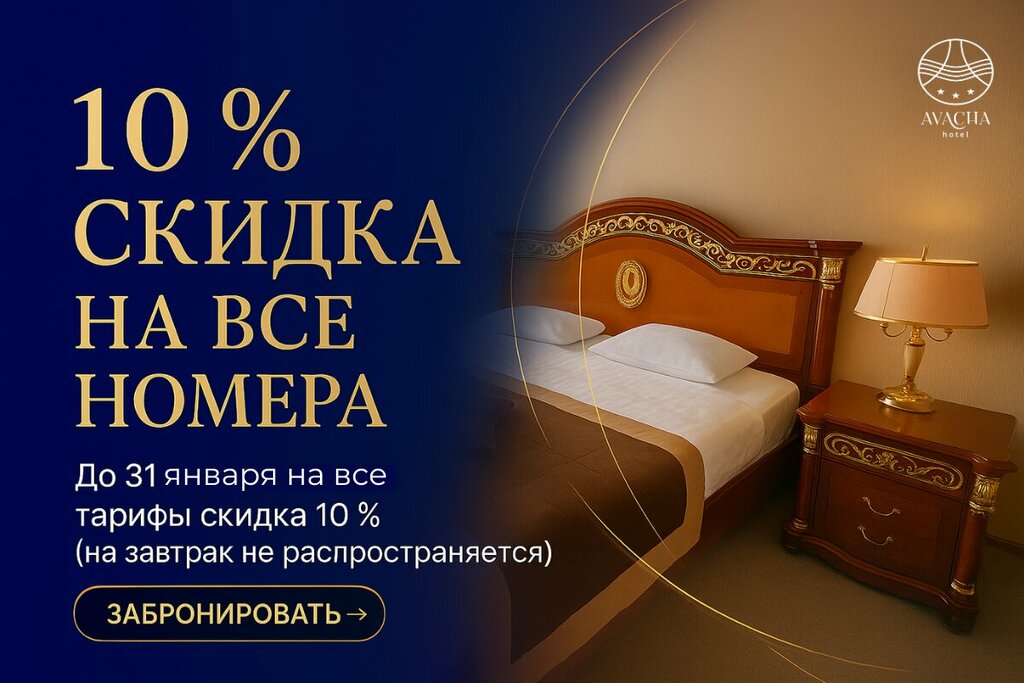 С завтраком. Стоимость за двоих 20200. Номер состоит из комнаты, спальни, санузла и прихожей. Площадь номера - 50 м2. Роскошь, комфорт и домашний уют Вы найдете в нашей гостинице «Авача». Обновленный после ремонта номерной фонд.