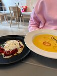 Расположено кафе в жилом комплексе Ботаника, сильно симпатичном! Интерьер минималистичный и очень приятный, большие окна! Единственный минус - это громкая музыка. Пожалуйста, включайте либо какую-нибудь спокойную и негромкую, либо не включайте совсем!! Очень тяжело приятно проводить время, за это и ставлю 4 звезды( Порции небольшие, стоимость тоже небольшая, поэтому нестрашно. Пробовали: - горячий тост со скрембл и прошутто - тыквенный суп с креветкой (реально одна креветка была🤣) - страчателла с печеными перцами Всё вкусно! Там такие милые букетики цветов продают всего за 700 ₽. Вторая половина кафе - магазин: продают всякое для интерьера и подарков.