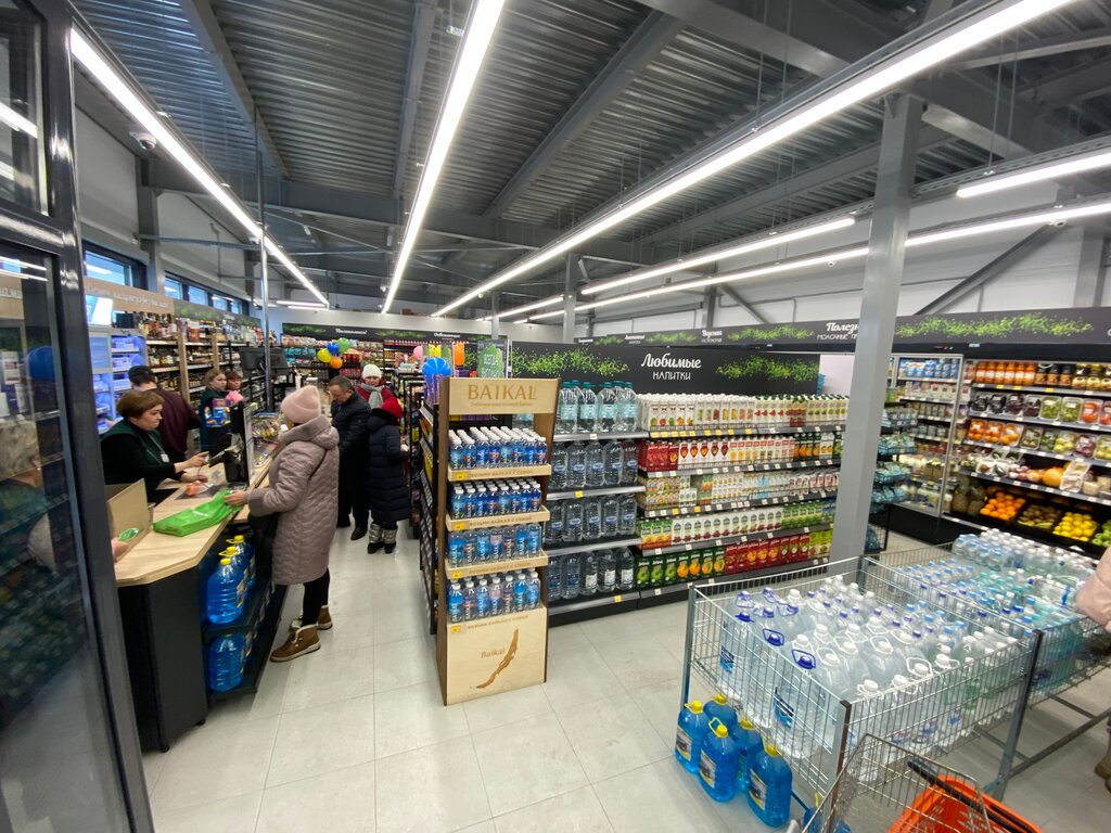 Большой ассортимент продукции, практически все есть для ежедневных нужд, хлеб свежий 👍🏻, как и все продукты в принципе, очередей нет, максимум три человека на кассе, сразу открывают вторую кассу, если становится больше. Персонал приветливый и вежливый, молочку сами на кассе упаковывают в пакет, пакеты дают открытыми, а не как в Пятёрке 😅, три минуты приходится открывать