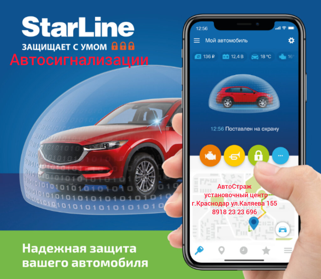Установка автосигнализации StarLine с дистанционным автозапуском двигателя в Краснодаре ул.Каляева 155. "АвтоСтраж" установочный центр. Качественная установка с гарантией от 3х лет. тел. 89182323696