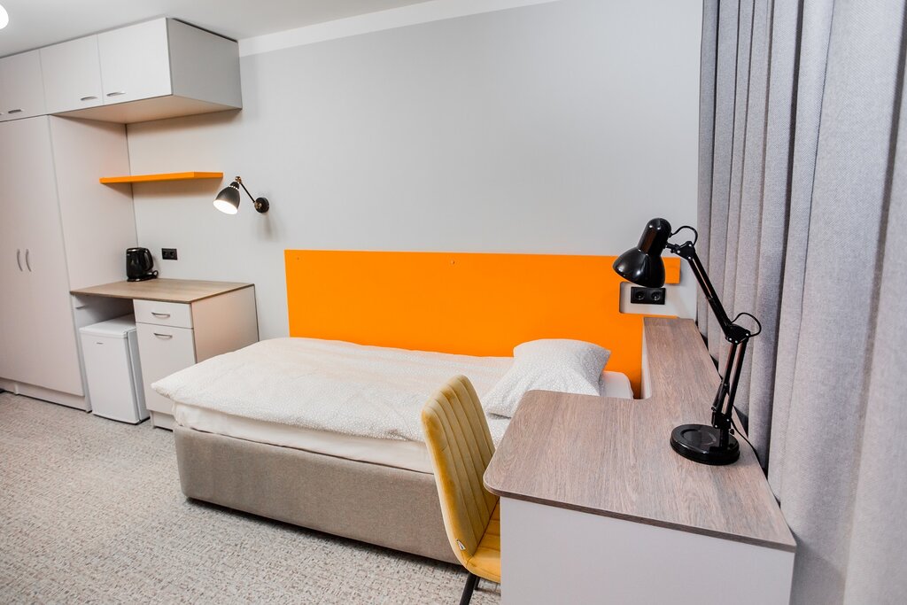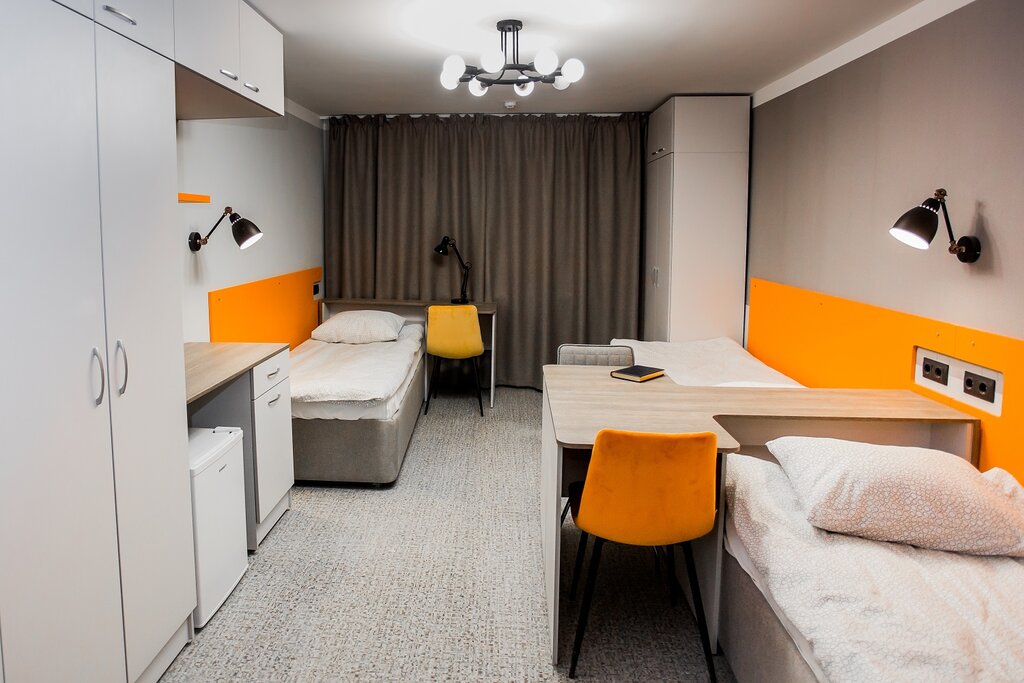 Большой номер для двоих. Каждое место предусматривает индивидуальный стол с зарядными устройствами для гаджетов, рабочее кресло и большой шкаф для личных вещей. Для дополнительного удобства в каждом номере холодильник, чайник, настольные лампы.
