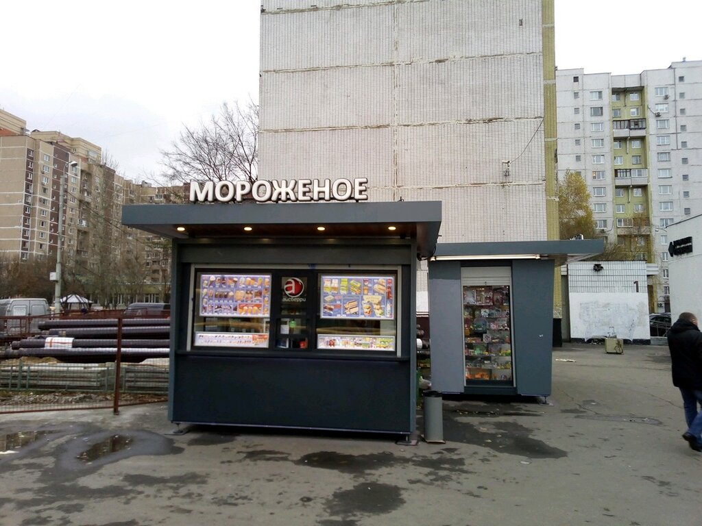 Там продаётся не только классное мороженное, но и безалкогольные напитки(кола и д.р.),а также рядом есть киоск с игрушками и прессой.