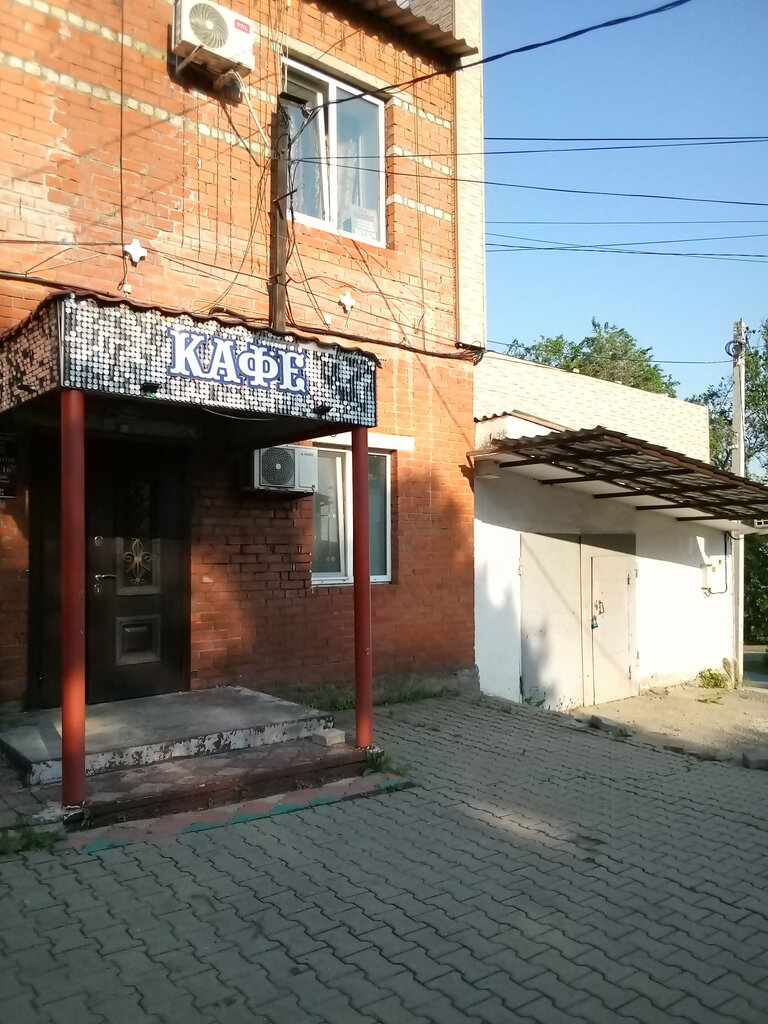 Кафе при одноимённой гостинице работает с 8-16 час., а если проводят банкет то дольше. Завтраки (с 8-10 час.) входят в стоимость проживания, преимущественно - яичница, омлет. Комплексный обед (с 12-15 час.) из 4-х блюд, можно на выбор заказать из блюд дневного меню. Карты принимают к оплате. Из конструктивных недостатков - очень высокая ступень при спуске в зал из помещения гостиницы, а также у раздаточного окна скользкие ступени (без металлических накладок по краю).