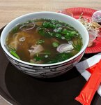 Не понимаю восторженных отзывов людей о данном заведении. Наверное худший Фо Шот Ванг, который я когда либо пробовал. Бульон на вид насыщенный, но на вкус абсолютно никакой и вдобавок чувствуется очень сильный привкус аниса или бадьяна, так и не понял. Обычный куриный бульон вкуснее и насыщенней будет. К супу положили только острый соус. Ни кинзы, ни мяты, ни лайма, ни ростков сои, ни уксуса не положили. Порция от силы 500 мл, даже не 900-1000 мл, как обычно принято у вьетнамцев. При этом цена супа 650 рублей. Однозначно не рекомендую данное заведение к посещению. 1 звезда за чистоту и антураж.