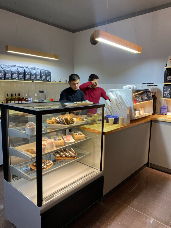 Чёткая кофейня 👍. Современный ремонт, спокойная не шумная улица. Обширный выбор десертов . Самые вкусные и нашумевшие это айс кофе урбеч и айс какао с сырной пенкой 👌