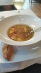 Салат "Цезарь" Ребят, это не "Цезарь" Яйца перепелиные, вау - на этом вся прелесть салата закончилась. Салат айсберг(, грудка куриная подошва, я так понимаю, что её отварную быстро поджарили и она естественно такой стала. Соус просто майонез с чесноком, ну вы хоть селёдки положите в соус, уже будет намёк на соус "Цезарь". Зато маслины положили к какому-то хрену. По-другому не скажешь. Уха, вроде ничего, но чтобы её съесть из этой "лаханки", нужно постараться. Я уже подумала тарелка для тех кто ест суп ро правилам этикета, начала её отклоняет от себя, уже плевать на этикет, есть хочется, на себя, но не сработало. Неудобно есть и всё, ложку приходится брать в руку, как нож, чтобы можно было погрузить её в суп и зачерпнуть. Не понравилось мне ничего. Пустая супная тарелка для наглядности этой "лаханки".