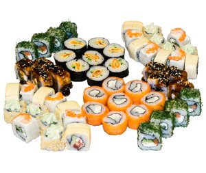 Роллы филадельфия люкс, кансай, дракон маки, калифорния, каори. не входит соус, имбирь, васаби