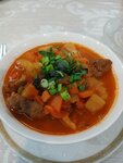 Нежная говядина, медленно томлённая до мягкости, с добавлением свежих овощей: картофеля, моркови, лука и болгарского перца. Бульон, насыщенный зирой, кориандром и черным перцем, наполняет блюдо уникальным ароматом. Подаётся горячей с щепоткой свежей