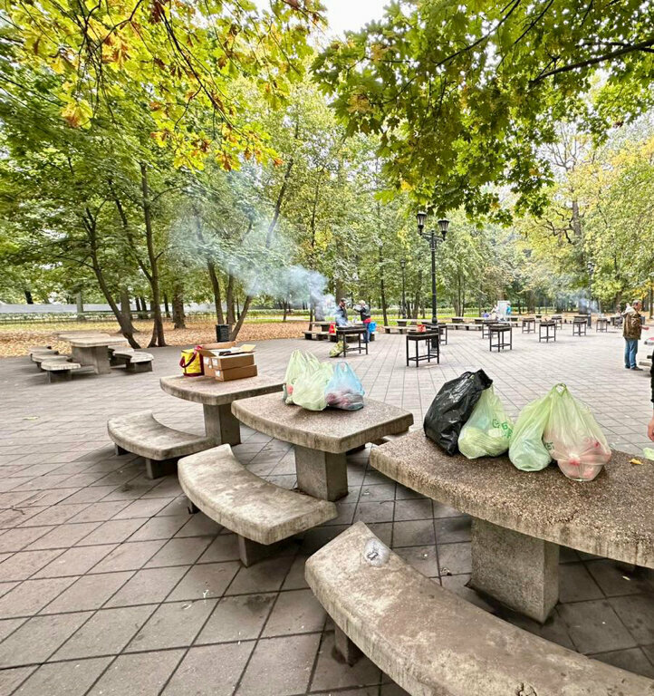 В последнюю неделю августа отмечали здесь пяточки дочки. Максимально комфортно, удобно, чистенько. Да, надо признать, что это многонациональное место, пользующееся своей популярностью из за удобства, доступности, локации, поэтому места занимали в 8 утра, чего и вам желаем))) все очень добродушные, угощают всеми национальными блюдами на огне и делятся рецептами. Были здесь с мужем дважды и теперь пришли всей семьёй и с друзьями. Если приходить после обеда, занимать столики после кого то, то ещё бонусом бесплатные угли, скатерти и хорошее настроение от отдохнувших. Постоянно выносят мусор. Рядом есть будочка с чаем и кофе и туалет. Для нашей компании с детьми от 1 месяца до 11 лет - недостатков не нашла. Так же есть детские площадки и даже аренда машинок и велосипедов. Досуг детям и взрослым максимально продуман. Рекомендую.