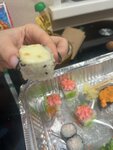 Первое фото как должно быть. Второе то что рис совершенно не держится, легкое макание в соевый соус , и все каждая рисинка побежала по своим делам. Третье фото , то как на самом деле должно быть. Плюс рис был достаточно соленым во взаимодействии с соленым соевым соусом можно запасаться водой… Готовят очень быстро ,только не понятно плюс это или минус. Если хотите насладиться вкусным сетом , то точно не из барракуды.