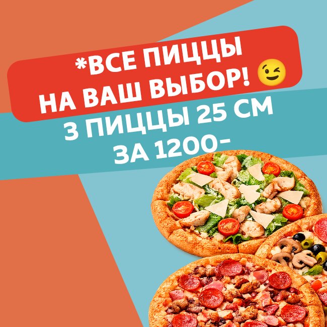 3 пиццы 25 см за 999 руб Пепперони, Маргарита, Ветчина грибы за 999 руб Обратите внимание: акции, скидки и промокода не суммируются