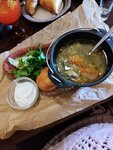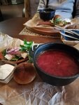 Восхитительный борщ, судак с картошкой, морс и суп с грибами, но овощи на гриле дорогие и не оправдывают свою цену. На вкус самые обыкновенные.