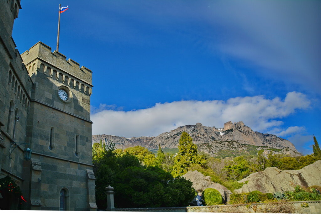 Суровая , но благородная Часовая башня Воронцовского Дворца. В 1841 году были установлены башенные часы лондонской фирмы «Джон Мур и сыновья» (John Moore and Sons) т.е эти часы старше на двадцать лет часов установленных на Биг Бене. В 2021 году башенным часам Воронцовского дворца исполняется 180 лет со времени установки. Часы двухсторонние ,один циферблат на Площадь , второй в хозяйственный двор. Во время Ялтинского Землетрясения в 1927 году часы накренились и встали на долгие годы. Но к нашему времени часы силами энтузиастов работают и играют мелодию каждый час . В Новый Год на площади Дворца жители и гости ждут бой курантов в Москве и на Часовой Башне Воронцовского Дворца .