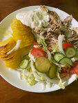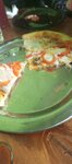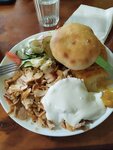 Шаверма на тарелке 350р. К ней подают не питу, а маленькую узбекскую лепёшку, но мягкую и тёплую, зачту как 5/5. Мяса не очень большая порция и поджаристых кусков нет вообще. 16/20 - хорошо прожарено, не пересушили. Одна картофелина нарезана слайсами и запечена. 7/10, всё же пресно. Свежие овощи - салат из огурцов, помидоров и вездесущей в наше время пекинской капусты. 4/5. Соленья. Невероятно, но 0! Ни-че-го. Соус - один классический, 3/5. 35/50 - плохо, тройка. Возможно, обеды тут вкусные, но шаверму на тарелке делают спустя рукава