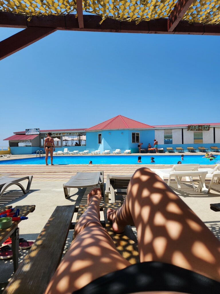 Бассеин не большой . Есть детский маленький. Бес подогрева . Шезлонгов мало на всех не хватает .люди скандалили из за этого . Были в плохую погоду море закрыто купатся запрещено . Но это не то место для отдыха. Цена 300 р на целый день . До 18 : 00